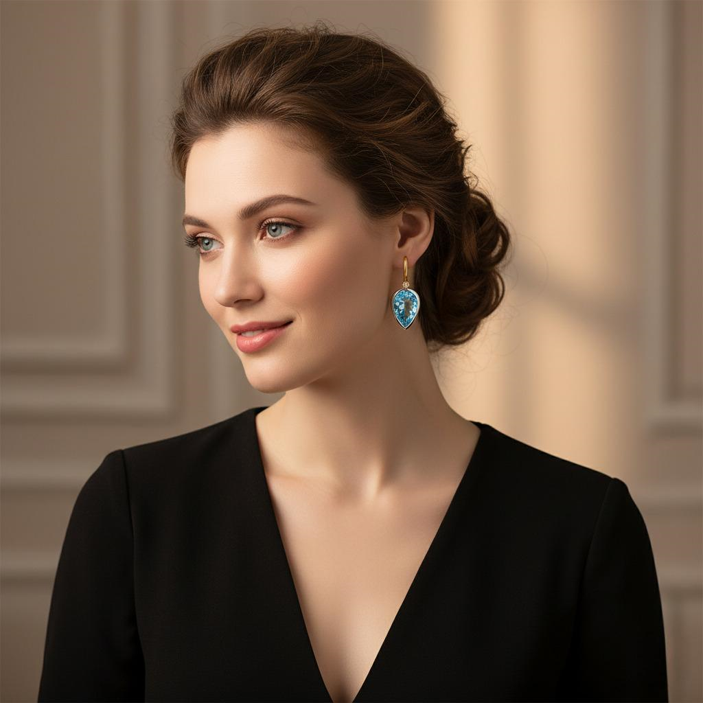 Ταυτόχρονα, ο σχεδιασμός αναδεικνύει τη διακριτική πολυτέλεια του διαμαντιού. Ένα μικρό, λαμπερό διαμάντι κοπής μπριγιάν κοσμεί το σημείο σύνδεσης, προσθέτοντας μια ανεπαίσθητη, αλλά ουσιαστική πινελιά λάμψης. Συνεπώς, ο συνδυασμός του χρυσού 18Κ, του Μπλε Τοπάζ pear cut και των διαμαντιών καθιστά αυτά τα σκουλαρίκια ιδανική επιλογή για ειδικές περιστάσεις.