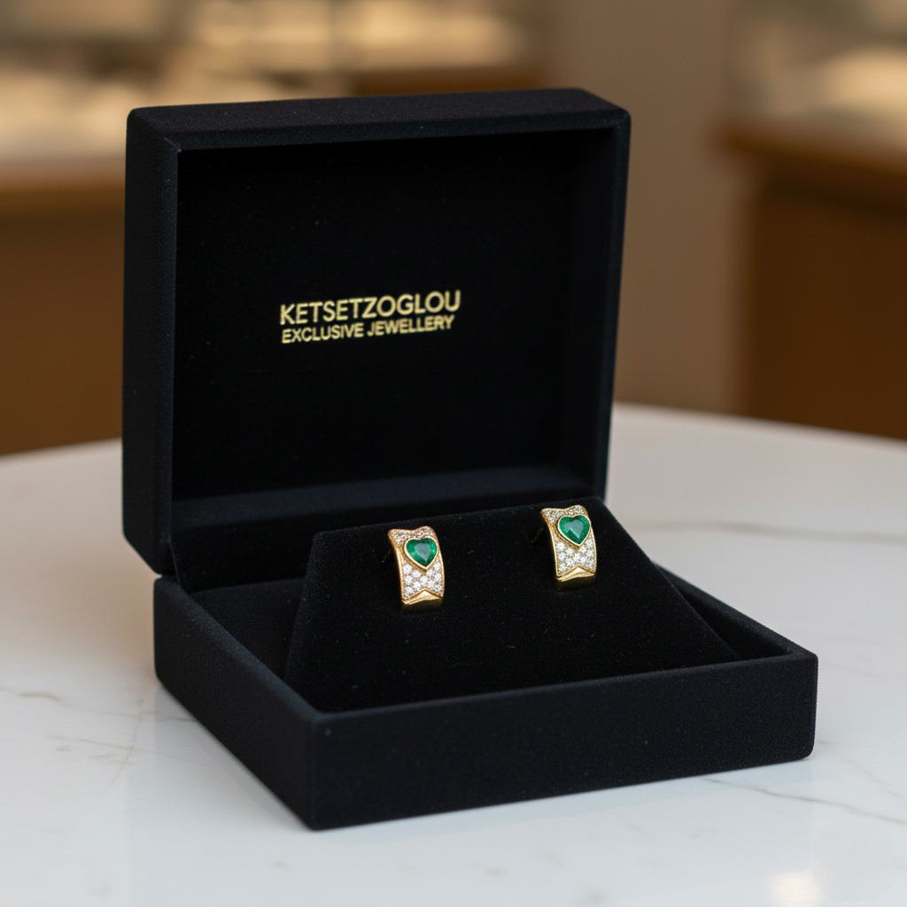 Επιπλέον, γύρω από την έντονη πράσινη καρδιά, αστραφτερά στρογγυλά διαμάντια (κοπής μπριγιάν) είναι με μεγάλη ακρίβεια τοποθετημένα σε δέσιμο pavé. Έτσι, δημιουργούμε ένα οπτικό αποτέλεσμα έντονης φωτεινότητας και λάμψης. Περαιτέρω, το χρυσό διαμορφώνει γεωμετρικές, ανάγλυφες γραμμές, οι οποίες πλαισιώνουν με δομή τόσο το κεντρικό στοιχείο όσο και τα διαμάντια. Επομένως, ο σχεδιασμός επιτυγχάνει μια θαυμάσια ισορροπία ανάμεσα στο έντονο χρώμα, την υψηλή λάμψη και τη ζεστασιά του μετάλλου. Τέλος, το πίσω μέρος φέρει ένα στιβαρό κούμπωμα ασφαλείας τύπου “δαγκάνα” (lever-back). Ως εκ τούτου, το κούμπωμα εξασφαλίζει άνετη και σταθερή εφαρμογή, επιτρέποντας την ασφαλή χρήση τους. Συνοψίζοντας, αυτά τα σκουλαρίκια αποτελούν μια επιλογή υψηλής κομψότητας, ενώ παράλληλα τονίζουν κάθε γυναικεία εμφάνιση και στυλ.