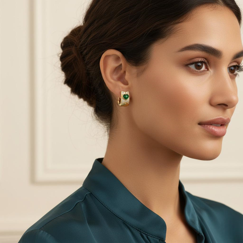 Αυτά τα εντυπωσιακά σκουλαρίκια-κρίκοι συνδυάζουν το πλούσιο χρώμα και την εκθαμβωτική λάμψη. Πρώτον, κατασκευάζουμε τα σκουλαρίκια από λαμπερό κίτρινο χρυσό Κ18, συνεπώς δίνουμε έμφαση στην πολυτελή τους εμφάνιση. Δεύτερον, κεντρικά, μια λεία, σμιλεμένη σε σχήμα καρδιάς, βαθυπράσινη πέτρα (πιθανόν νεφρίτης ή μαλαχίτης) κυριαρχεί, καθώς τραβά αμέσως την προσοχή του θεατή.
